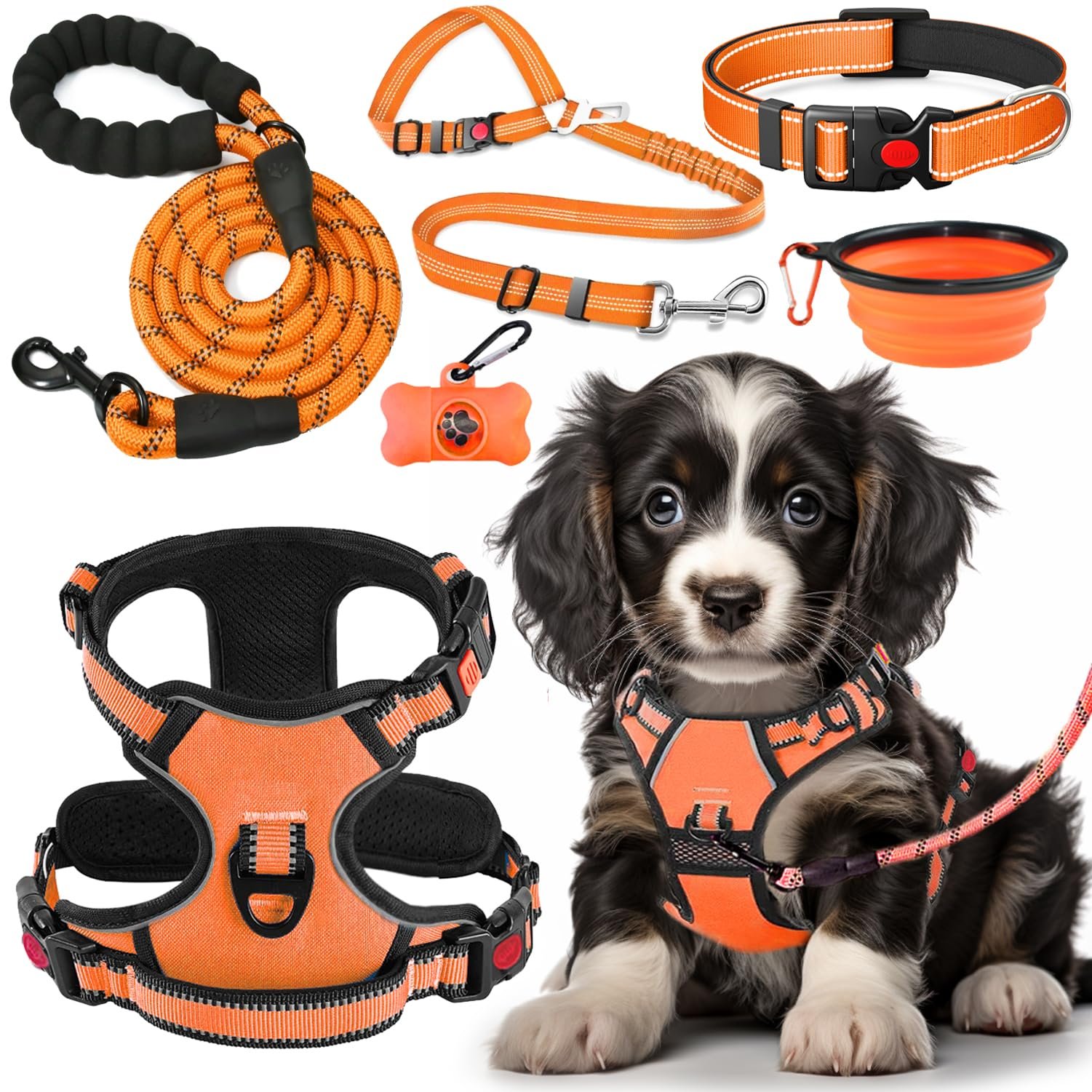 LOBEVE No Pull Dog Harness, Collar & Leash Set | Includes Dog Seat Belt, Collapsible Bowls & Poop Bag Dispenser. Ideal for Training, Walking, Hiking. Fits Small to Large Dogs (Orange-M)